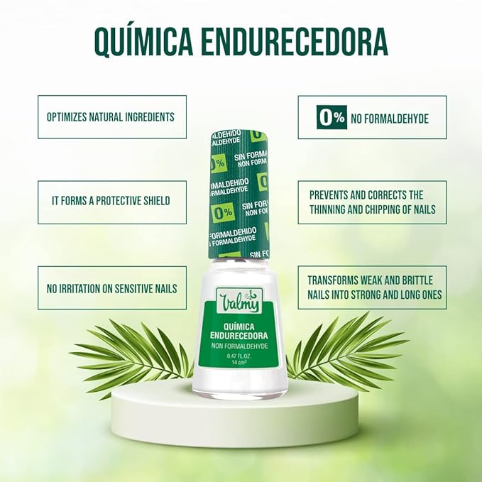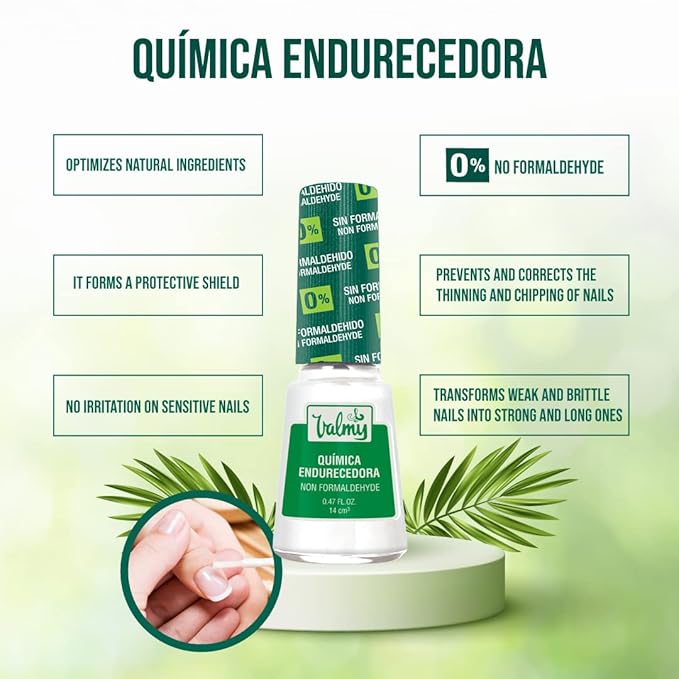 - 🌟 FORMALDEHYDE-FREE HARDENER: Our Valmy Química Endurecedora is specially formulated with a formaldehyde-free treatment that provides a protective barrier to your nails. This barrier strengthens and transforms your nails, improving their condition and protecting them from external aggressors that can cause damage.🌟
