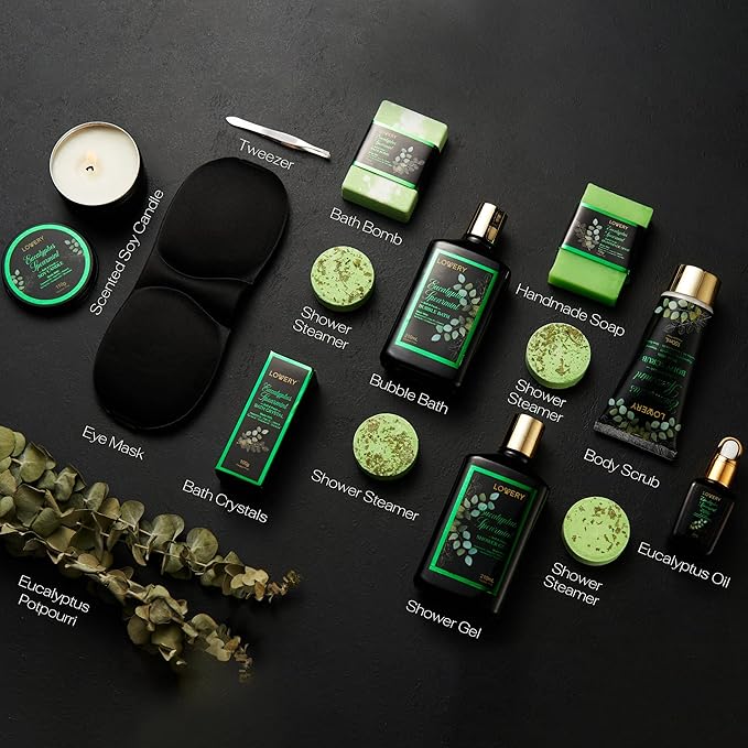- HOME SPA SESSION - Lovery Eucalyptus Spearmint Bath Set is specially formulated to indulge your Mind, Soul and Body. It contains a combination of Mint Fragrance, all-natural ingredients and Essential Oils. These beauty products are made with Peppermint Oil, Argan Oil, Vitamin E, Tea Tree Oil, Eucalyptus Oil and Shea Butter.