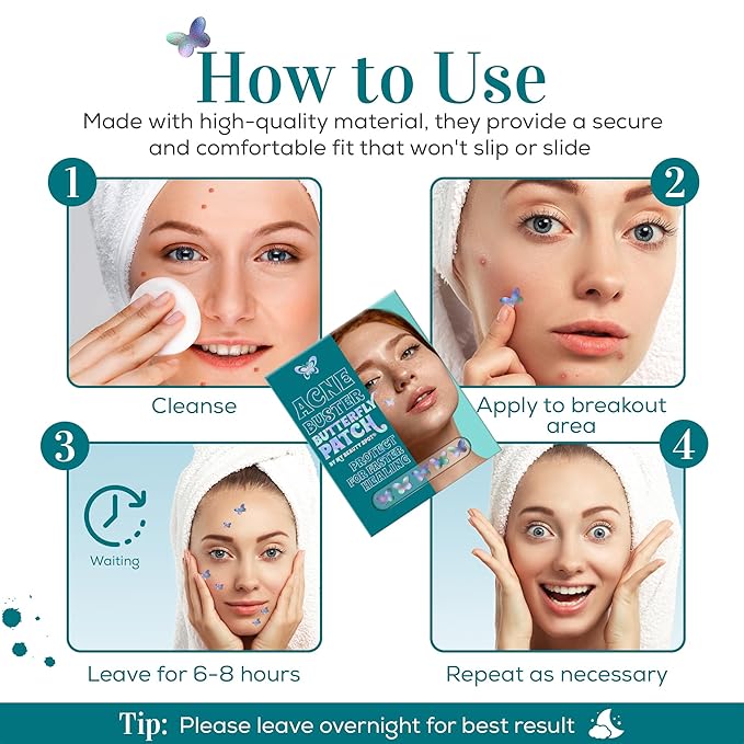 - PROTECT AND HEAL: These acne patches are designed to be a protective covering while treating blemishes, preventing further irritation, and promoting faster healing. Say goodbye to unsightly acne, simply apply to the affected area and watch as they work their magic, clearing up blemishes and leaving your skin looking clear and radiant.