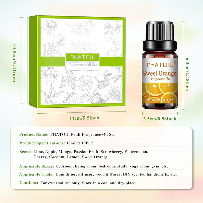 - PHATOIL Fragrance Oil Set: This fruity fragrance oil with a long lasting scent that pampers all your senses. Suitable for any place; For example: office, living room, kitchen, car, yoga studio, etc.
