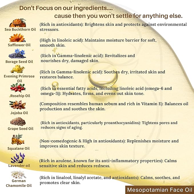 Mesopotamian Face oil for women, Cold-Pressed, Organic Anti Aging Facial Oil, Sea Buckthorn, Safflower, Borage Seed, Rosehip, Jojoba Oil, Squalane, Lavender Oil… 1oz.