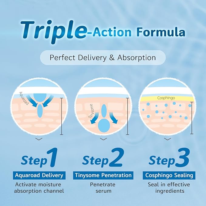 - 【Triple-Action Formula for perfect delievery and absorption】1. Aquaroad delievery: Instant activation of moisture absorption channel 2. Tinysome Penetration: Penetrating serum allows full delievery 3. Cosphingo Sealing: Seals in effective ingredients