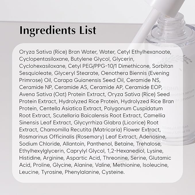 MIDHA Rice Protein Serum, 1.01fl.oz/30ml, Deep hydration, Moisture balance, Firm elasticity, Skin barrier support, Ceramide skincare, Non-greasy finish, Smooth and hydrated, vegan