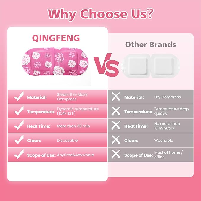 - ✨👁️【104~113℉ Hot Compress for Eyes】Our hot eye patch adopts steam heating and temperature control technology- up to 104~113℉.This self warming heated eye mask will release fine moist steam, comfort the skin around eyes, let tired eye enjoy the steam, it kept working with comfortable steam for your eyes.