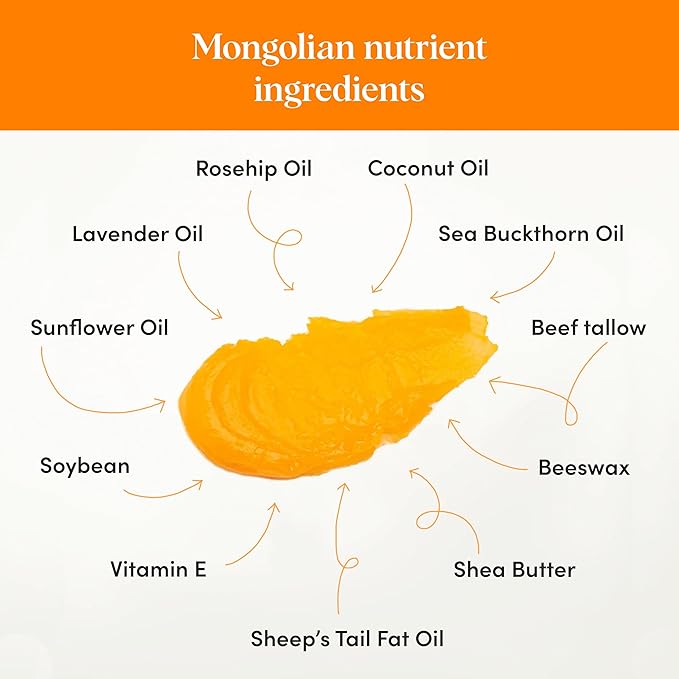- Premium Organic Ingredients: Infused with the powerful combination of sea buckthorn fruit oil, Mongolian sheep’s tail fat, and rosehip oil, this body butter offers a vitamin-rich treatment for your skin.